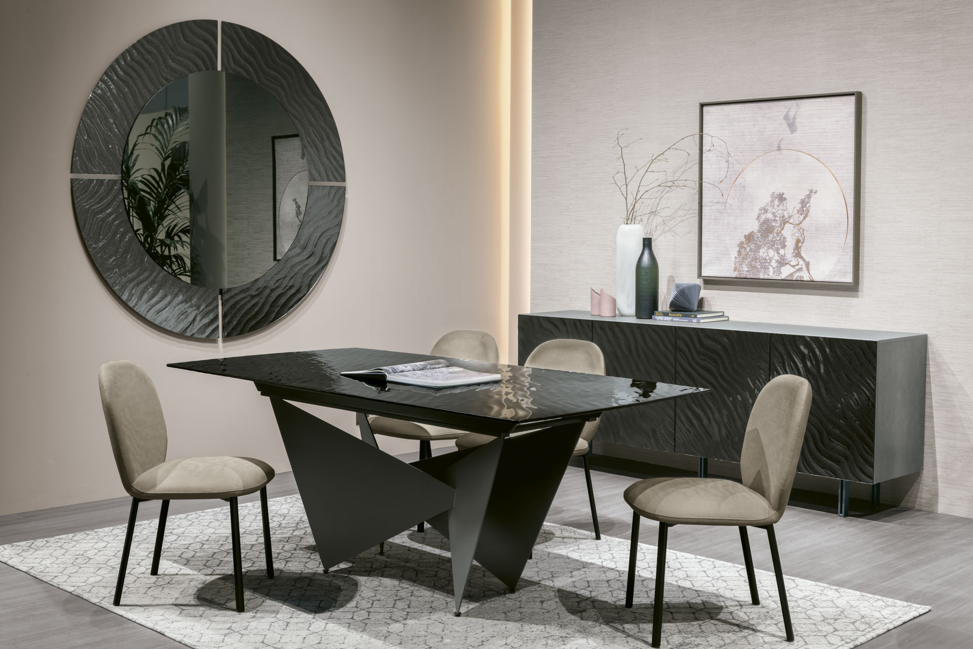 Disponibile sia in versione fissa che allungabile, Aliseo si adatta a spazi e occasioni mantenendo intatta la sua presenza scenica. Il piano può essere rettangolare o a botticella e realizzato in gres porcellanato, vetro ondulato o vetro dune: finiture che amplificano luce, riflessi ed eleganza. Versatile, sofisticato e di forte impatto estetico, Aliseo trasforma ogni momento conviviale in un’esperienza di stile.